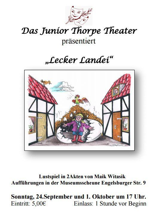 Das Thorpe Theater präsentiert in diesem Jahr das Lustspiel von Dietmar Gebert "Senioren ausser Rand und Band", das Jugendtheater zeigt das selbstgeschriebene Stück "Lecker Landei".